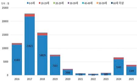 (그래프)2016∼2025년 연령대별 성홍열 환자 발생 추이 (2025.5.24. 기준; 명)