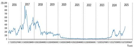 (그래프)2016∼2025년 주별 성홍열 환자 발생 추이 (2025.5.24. 기준; 명)