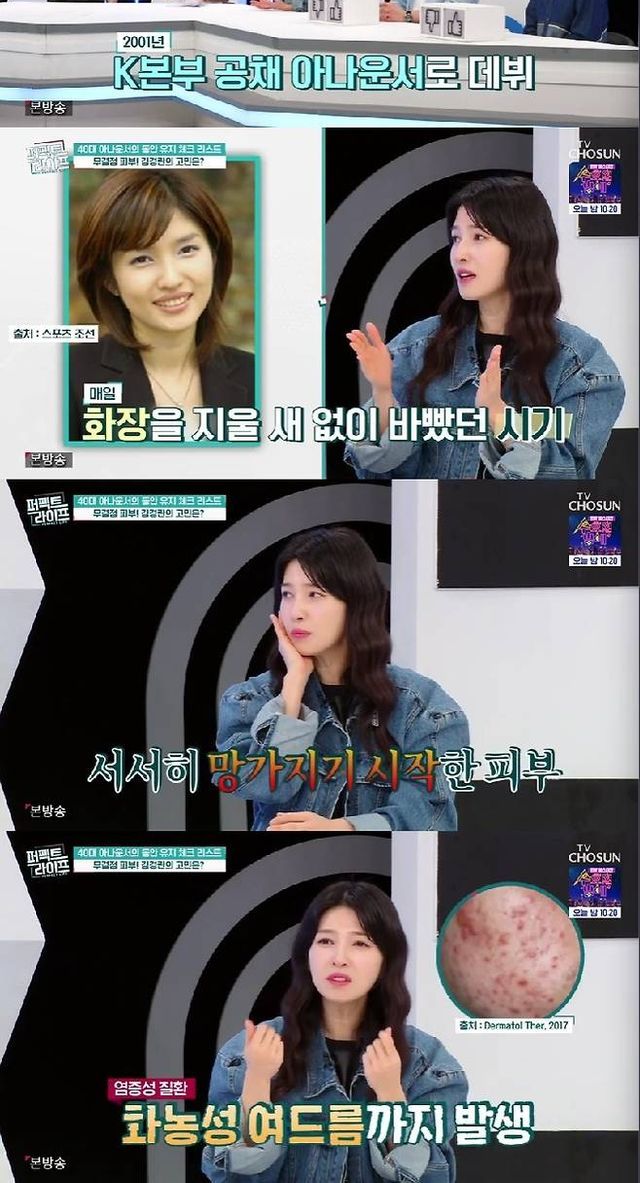 김경란은 "2001년에 KBS 공채 아나운서가 돼서 그때부터 매일 화장을 하고 뉴스만 하는 게 아니라 녹화도 하고 촬영도 하다 보니 24시간 중 20시간을 화장을 한 채로 지냈다"라고 이야기했다.