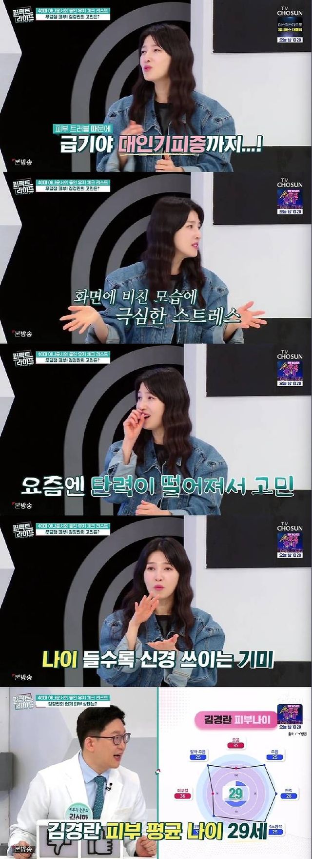 김경란은 "이런 얘기 들으면 약간 인생 드라마 같다. 사실 피부가 인생 최대의 고민이었다"라고 해서 주위를 놀라게 했다.