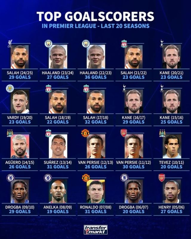 축구 통게 매체 ‘트랜스퍼마크트’는 지난달 31일(한국시간) 공식 SNS를 통해 최근 20년 동안 프리미어리그 득점왕을 차지한 선수들을 종합적으로 게시했다. 2005-06시즌 득점왕 티에리 앙리부터 시작하여 2024-25시즌 득점왕 모하메드 살라까지 매년 득점왕의 사진이 나란히 있었다.