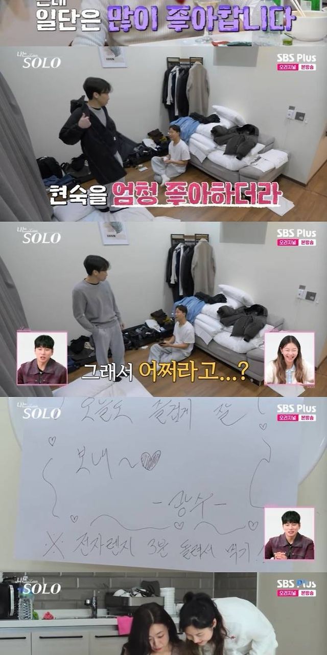 광수는 "형님이 초이스 하면 다 되는 거냐"라고 농담하며 "형 나는 현숙밖에 없다. 현숙을 되게 많이 좋아한다. 죄송하지만 형처럼 '순자도 좋아' 이런 거 나는 없다. 모르겠다. 현숙이 마음이 중요하지 않겠냐. 현숙이가 형을 좋아한다고 하면 난 떠날 수 있다. 내가 말씀드리고 싶은 건 현숙을 되게 많이 좋아한다는 것만 말하고 싶은 거다. 요즘에 걔 때문에 미치겠다"라고 강조했다.