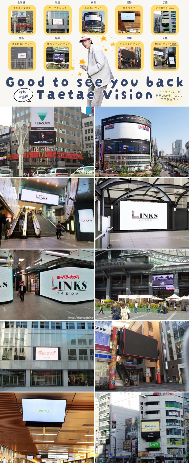 일본에서는 도쿄, 오사카, 나고야, 홋카이도, 아키타, 히로시마, 도쿠시마, 후쿠오카, 오키나와 등 9개 도시의 대형 전광판에서 뷔의 전역을 축하하는 영상이 상영될 예정이다.