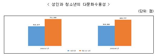 이에 따르면 지난해 청소년의 다문화 수용성은 69.77점으로 직전 조사였던 2021년(71.39점) 대비 1.62점 낮아졌다. 관련 항목에 관해 본격적인 조사가 시작됐던 2015년(67.63점)부터 2018년 71.22점, 2021년 71.39점으로 줄곧 상승세였으나 처음으로 하락 전환한 것이다. 그러나 성인의 경우 3년 전(52.27점)보다 1.11점 높아진 53.38점으로, 2015년(53.95점) 이후 줄곧 하락하다가 9년 만에 반등했다.