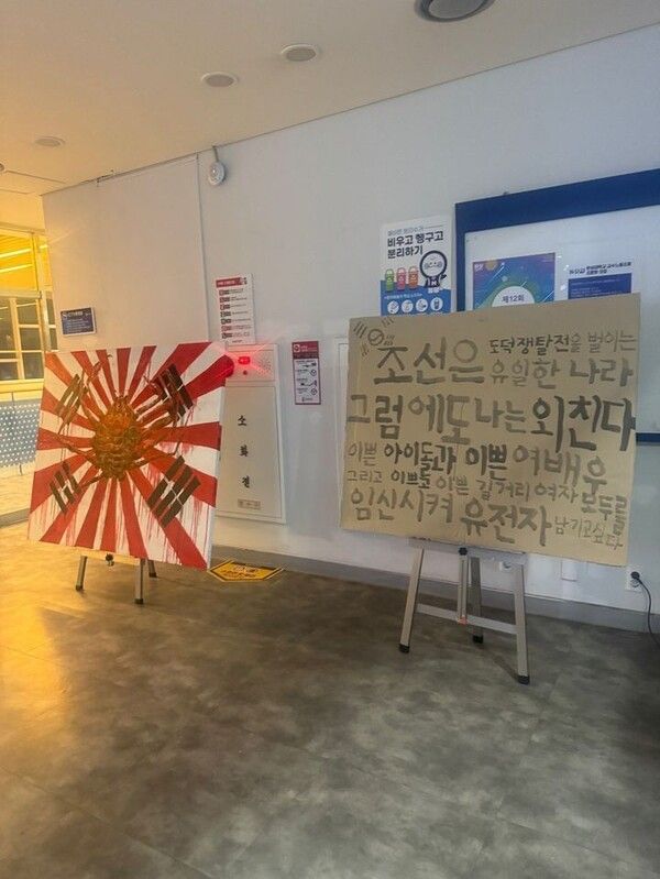 뉴시스 보도에 따르면, 4일 한성대에 따르면 전날 오후 11시10분께 학교 건물 내에 욱일기와 태극기를 섞어놓은 듯한 그림과 함께 "조센징(한국인 비하 표현)", "역겨운 조센징들은 부끄러움을 모른다" 등 혐오 문구가 적힌 전시물 4점이 설치됐다.