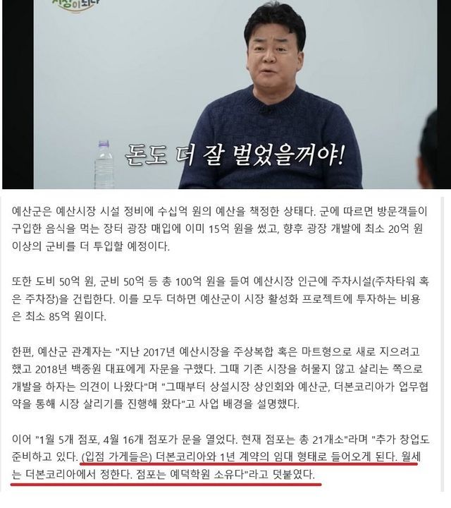 그냥 예산시장이 유명해지기 전에는 월세 30만원이면 되었는데 예산시장 유명해지면서 월세 올랐다는 기사가 전부임
