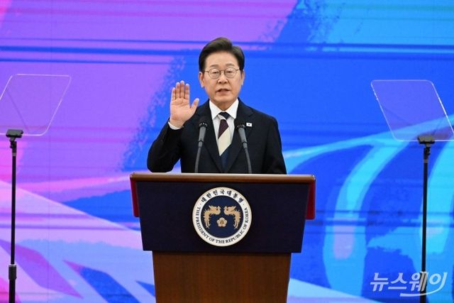 이재명 대통령이 4일 오전 서울 여의도 국회 로텐더홀에서 열린 제21대 대통령 취임선서식에서 선서를 하고 있다. 사진=국회사진기자단