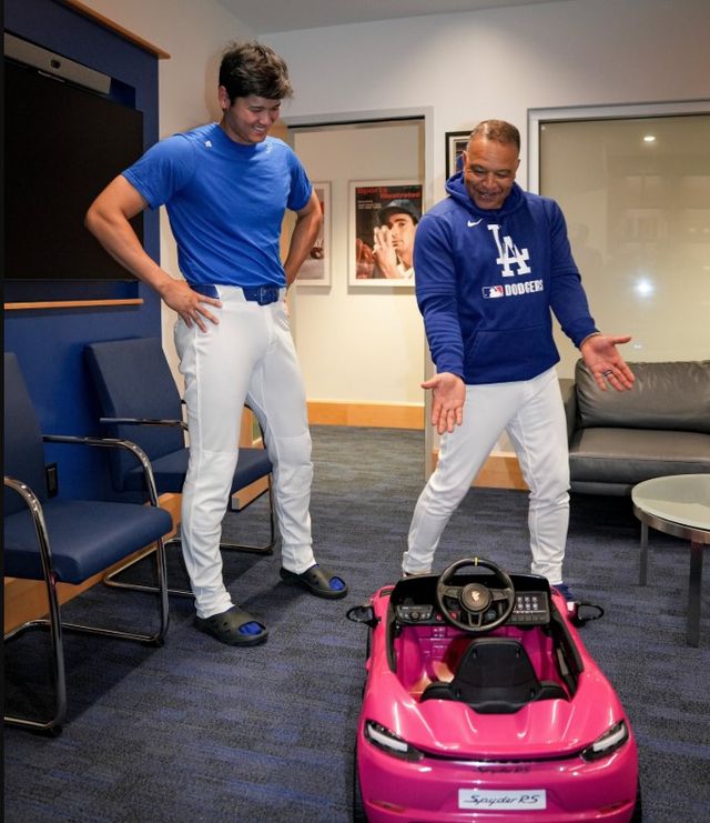 로스앤젤레스(LA) 다저스 데이브 로버츠 감독과 슈퍼스타 오타니 쇼헤이 사이 '유아용 자동차' 선물 릴레이가 이어졌다.