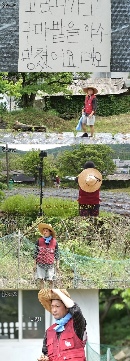 김대호는 "여기가 고구마인데, 여기 밭을 자꾸 건드는 것 같다. 우리의 작전은 고라니가 우리 밭까지 못 오게 여기서 진지를 구축하는 거다. 이따 부비트랩을 설치할 거다"라고 말했다. 제작진은 김대호에게 "할머니 밭을 방패 삼는거냐"고 질문했다.