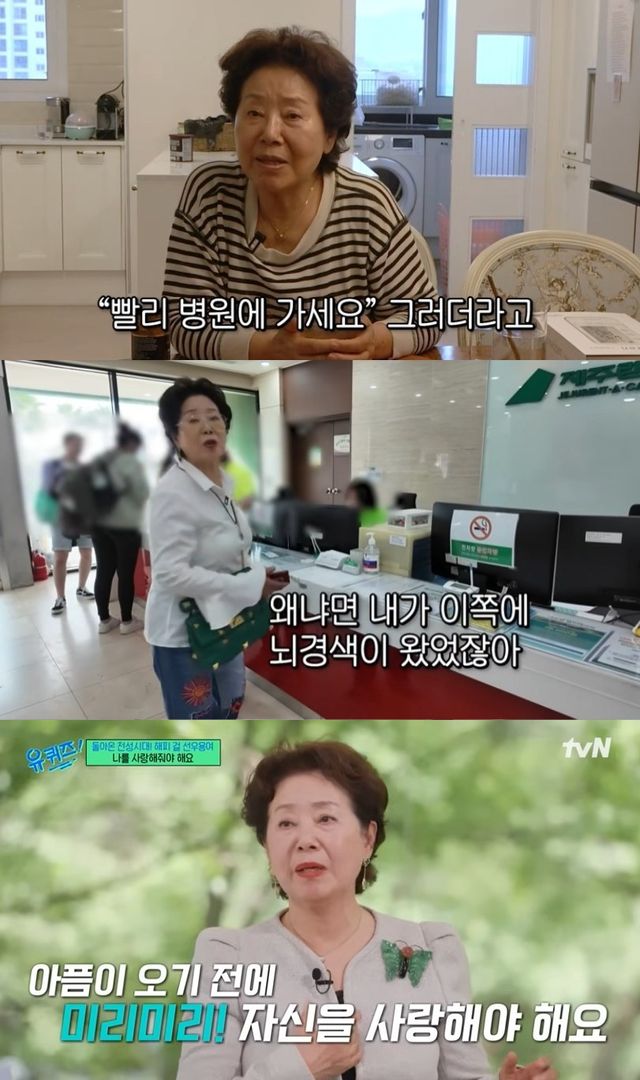 앞서 선우용여는 최근 tvN '유 퀴즈 온 더 블럭(이하 '유퀴즈')'과 개인 채널을 통해 과거 방송 녹화 중 뇌경색 증상을 겪은 아찔했던 순간을 털어놓았던 바.