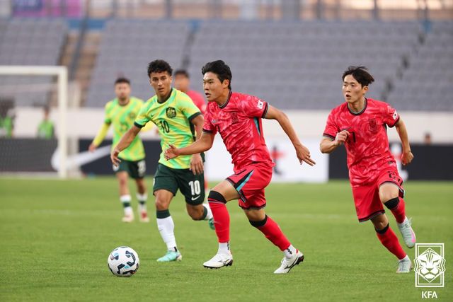 한국은 후반 30분 최우진이 날렵한 턴으로 상대 압박을 벗겨내고 페널티지역 앞에서 동료와 공을 주고 받은 뒤 날카롭게 감은 왼발 슛으로 오랜만에 호주 골문을 두드렸다. 하지만 최우진의 슈팅은 밖으로 크게 벗어났다.