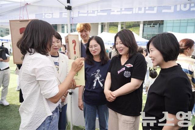 의원연구단체 '탄소중립연구소Ⅲ' 회원들이 '2025 환경의 날 행사'에서 부스 관계자에게 설명을 듣고 있다/사진=용인시의회