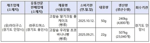 [와이뉴스] 식품의약품안전처는 식품제조·가공업체인 ‘(유)마더구스(경기도 안양시 소재)’가 제조하고 ‘(주)푸드머스(경기도 용인시 소재)’가 유통·판매한 ‘고칼슘 딸기크림 롤케이크’와 ‘고칼슘 우리밀 초코바나나빵’에서 식중독균인 살모넬라균이 검출되어 해당 제품을 판매 중단하고 회수 조치한다고 밝혔다.