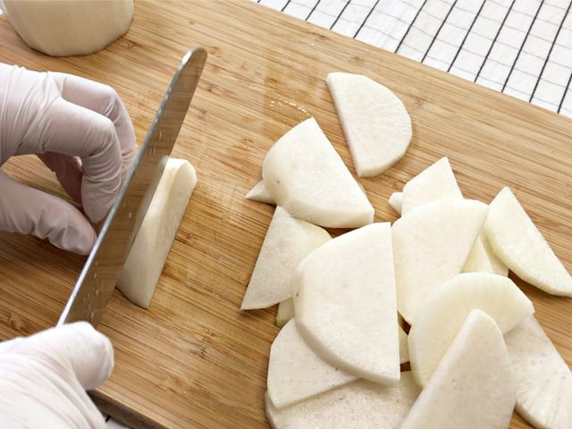 무는 3/4은 반달모양, 1/4은 동그랗게 썰어주세요.
