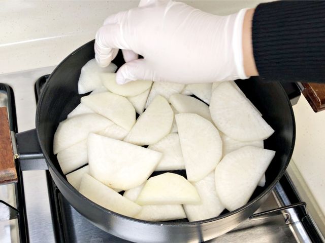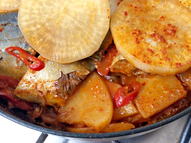 가장 먼저 반달로 썬 무를 바닥에 깔고요.