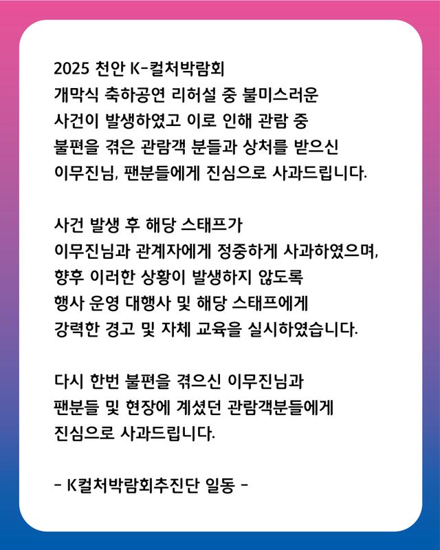 먼저, 천안 K-컬처박람회 행사 과정 중 발생한 불미스러운 일로 인해 이무진님과 팬 여러분, 그리고 현장을 찾은 관람객 여러분께 깊은 사과의 말씀을 드립니다.