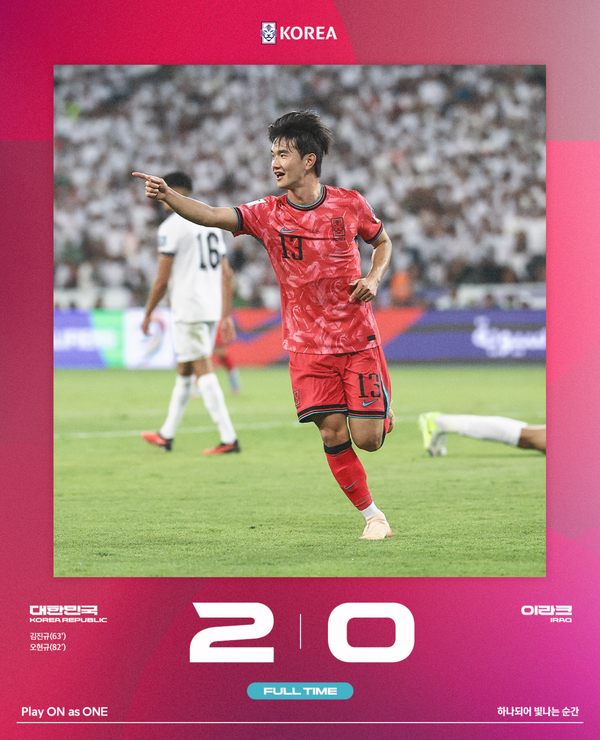 홍명보 감독이 이끄는 대한민국 남자 축구대표팀은 6일(한국시간) 이라크 바스라의 바스라 인터내셔널 스타디움에서 2026 국제축구연맹(FIFA) 북중미 월드컵 아시아 3차 예선 조별리그 B조 9차전을 치러 이라크에 2-0으로 이겼다. 한국은 승점 19점으로 조 1위를 지키며 남은 쿠웨이트전 결과에 관계 없이 월드컵 본선 진출에 성공했다.