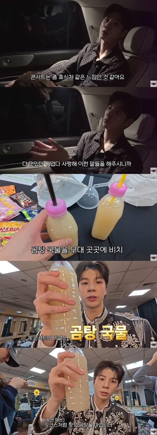 무대 준비 중 정동원은 "방송에서 제기 얘기한 적 있는데 콘서트 할 때 항상 곰탕 국물을 먹는다. 여러 개를 준비해서 무대 곳곳에 놓는다"고 밝혔다. 또 그는 "제 콘서트에서 제일 중요한 게 바로 이 곰탕 국물이다. 이걸 먹으면 무대 할 때 배도 차고 기름기가 있어서 목이 괜찮다. 과학적으로 밝혀진 건 아니지만 징크스다"라고 말했다.