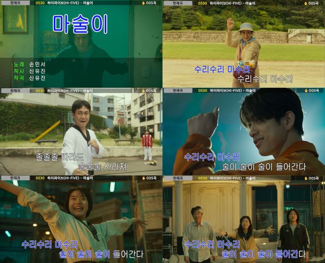 또한 노래방 자막과 함께 레트로 감성을 자극하는 구성진 가락에 맞춰 괴력의 태권소녀 완서(이재인)와 아빠 종민(오정세)의 부녀 케미가 유쾌함을 더하는 귀여운 액션신부터 완서와 빌런 영춘(박진영)이 제대로 맞붙는 짜릿한 초능력 액션 하이라이트까지 엿볼 수 있어 궁금증을 증폭시킨다. 이처럼 초능력급 웃음 폭탄으로 극장가를 사로잡고 있는 영화 ‘하이파이브’의 ‘마술이’ 뮤직비디오는 영화를 관람한 관객들에게는 또 한 번의 웃음 충전을, 아직 영화를 관람하지 못한 관객들에게는 코믹 액션 ‘하이파이브’에 대한 기대감을 끌어올린다.