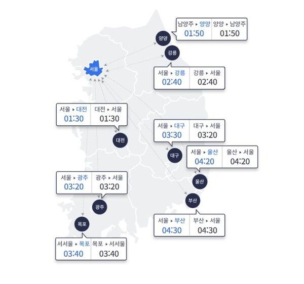 상행선은 ▲부산~서울 4시간30분 ▲대구~서울 3시간30분 ▲광주~서울 3시간20분 ▲대전~서울 1시간40분 ▲강릉~서울 2시간40분 ▲울산~서울 4시간20분 ▲목포~서울 3시간40분이다.