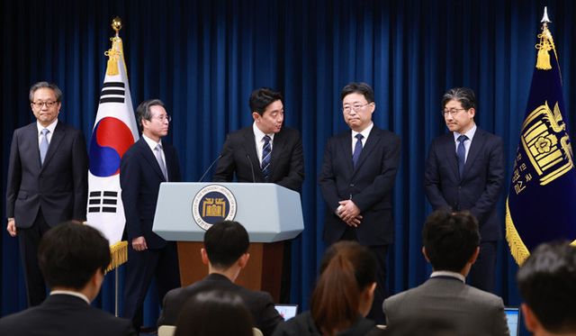 (왼쪽부터) 문진영 사회수석비서관, 김용범 정책실장, 강훈식 비서실장, 하준경 경제성장수석, 류덕현 재정기획보좌관. ⓒ 연합뉴스