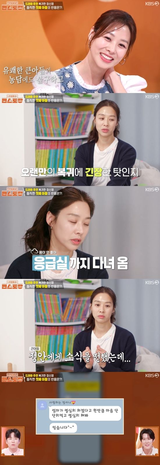 장신영은 "며칠 전에 갑자기 되게 아파서 응급실에 가서 검사를 했다. 큰아들과 문자를 했다. '엄마가 하고 싶었던 거니까 최선을 다해서 하라'고 든든하게 응원해 줬다. 힘이 났다"라며 다정한 큰아들을 자랑했다.
