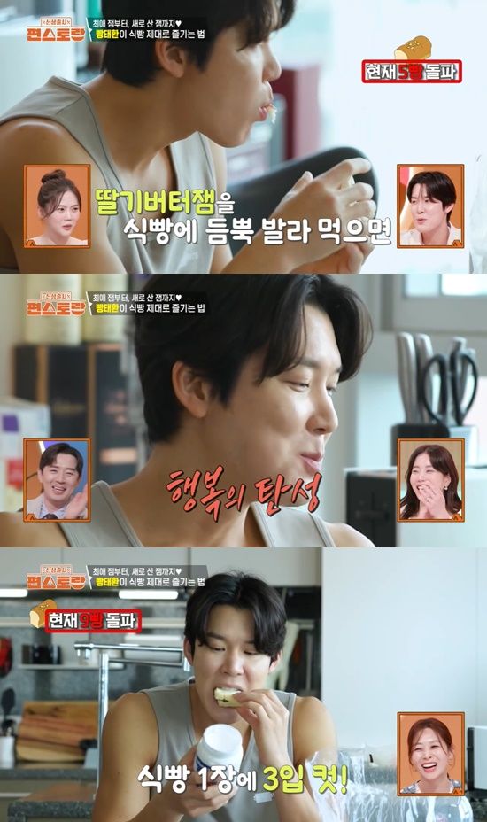 아침부터 식빵 먹방을 보여준 박태환은 "행복은 멀리 있는 게 아니다. 내 눈 앞에 있다. 이게 행복"이라며 '찐미소'를 보였다.