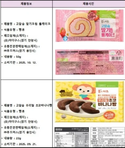 문제가 된 제품인 고칼슘 딸기크림 롤케이크의 용량은 50g으로, 소비기한은 올해 10월 12일까지다. 고칼슘 우리밀 초코바나나빵 용량은 22g, 소비기한은 9월 21일이다.
