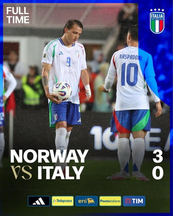 7일(한국시간) 노르웨이 오슬로의 울레볼 스타디온에서 2026 국제축구연맹(FIFA) 북중미 월드컵 유럽 예선 I조 3차전을 치른 이탈리아가 노르웨이에 0-3으로 패했다. 이탈리아는 승점을 추가하지 못하며 조 4위(승점 0)가 됐고, 노르웨이는 3경기 전승으로 조 1위(승점 9)에 올랐다.