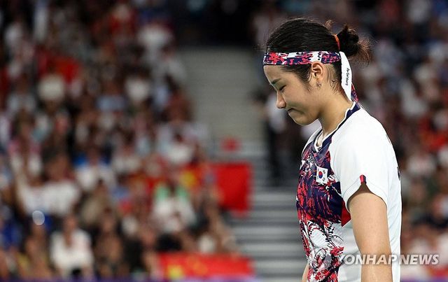 2024년 8월 5일(현지시간) 프랑스 파리 포르트드 라 샤펠 아레나에서 열린 2024 파리올림픽 배드민턴 여자 단식 결승전에서 한국 안세영이 중국 허빙자오에게 실점 후 아쉬워하고 있다 / 연합뉴스