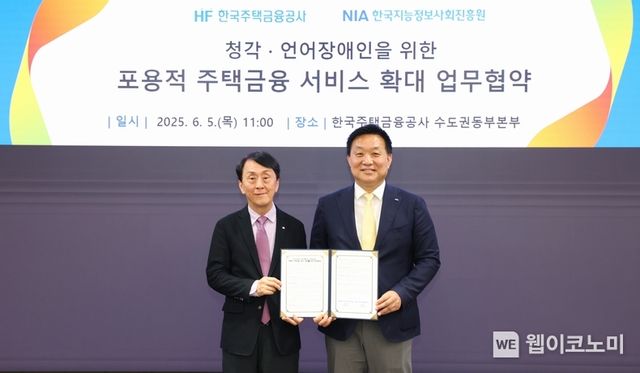 한국주택금융공사(사장 김경환)는 한국지능정보사회진흥원(원장 황종성)과 ‘청각·언어장애인을 위한 포용적 주택금융 서비스 확대 업무협약’을 서울 중구에 위치한 공사 수도권동부본부에서 체결했다고 6일 밝혔다.