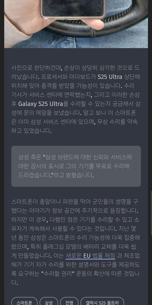 삼성에선 무상 수리 해준다고 발표했는데, 커뮤니티에선 사실상 전손이라 새거로 주지 않을까 예상한다고