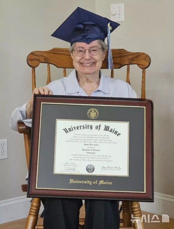 뉴시스 보도에 따르면, 4일(현지시간) 뉴욕포스트에 따르면 미국 뉴햄프셔에 사는 조안 알렉산더(88)는 지난달 60년 만에 메인대학교로부터 교육학 학위를 수여 받았다.