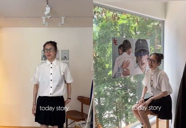 고현정은 하얀색 반팔 셔츠, 검은색 미니스커트를 입고 청순한 매력을 뽐냈다.