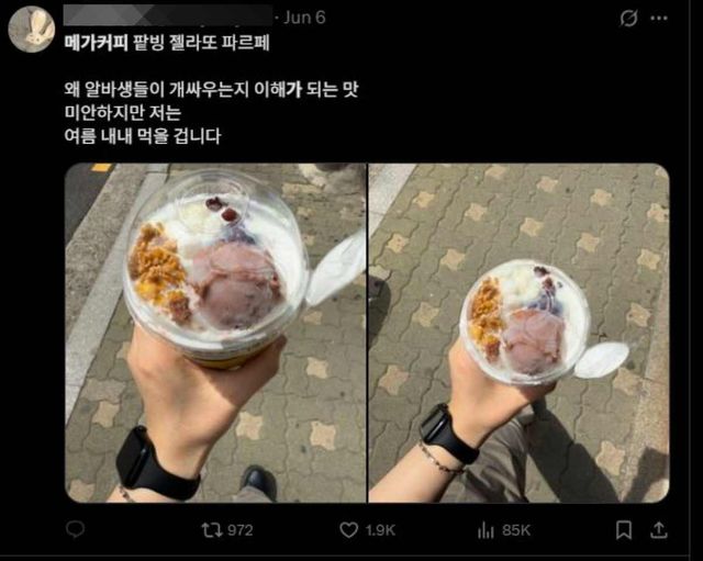메가MGC커피는 지난 4월 말 팥빙 젤라또, 망빙 파르페 등 1인용 컵빙수를 4400원에 출시했다. 이 중 팥빙 젤라또는 옛날 스타일 팥빙수에 각종 토핑을 올린 형태로, 출시 이후 SNS와 커뮤니티에서 입소문을 타며 주목받고 있다.