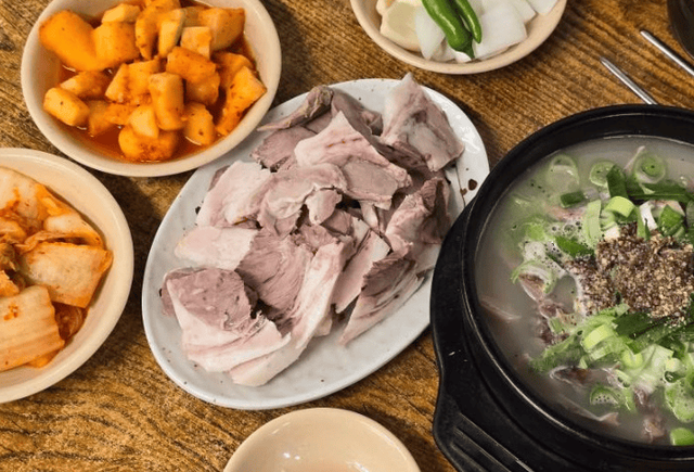 24시간 동안 정성껏 고아낸 진한 육수에 순대와 머릿고기를 듬뿍 넣어낸 특별한 요리가 이곳의 자랑입니다. 특히, 머릿고기가 듬뿍 들어 있어 포만감이 느껴지는 이 한 그릇은 돼지국밥의 진한 풍미를 전합니다.