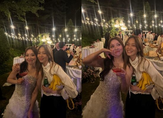 사진 속에는 신부대기실을 찾은 선예가 웨딩드레스를 입은 민과 팔짱을 끼고 미소 짓고 있다. 2부 식에서는 은빛 드레스를 입은 민의 사랑스러운 분위기가 돋보인다.