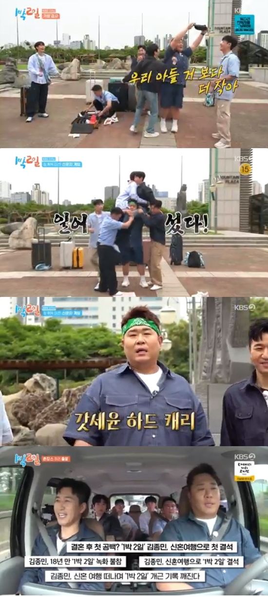 김종민은 18년만의 첫 휴가에 "느낌이 이상하다. 나 다음 촬영에 없다"고 말했다. 문세윤은 김종민한테 신혼여행에 가서도 야외취침하고 게임도 하라는 얘기를 해줬다.
