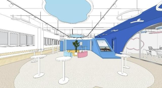 입구로 지나면 가장 먼저 마주하는 로비 공간 ‘문화카페’는 비행기에 탑승한 듯한 느낌을 살렸다. 파란 하늘 위 비행기처럼 파란색으로 개방감을 살려 청소년 누구나 자유롭게 어울리거나 편히 쉴 수 있는 공간이 될 예정이다.