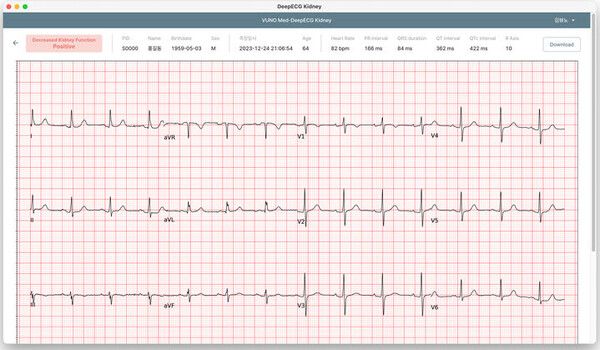 딥ECG Kidney는 딥러닝 알고리즘을 기반으로 12채널 유도 심전도 데이터를 분석해 비침습적으로 신속하고 정확하게 콩팥기능의 저하를 선별한다. 이 기기는 임상에서 만성 콩팥병(CKD) 진단에 활용되는 추정사구체여과율(eGFR)을 기준으로 중등도 이상 콩팥기능이 저하된 환자군을 선별하도록 학습됐다.