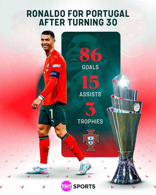 호날두의 득점 기록이 다시 조명받았다. 이날 그가 터뜨린 득점은 A매치 138호 골. 같은 날 스포츠 매체 TNT스포츠는 호날두가 30세 이후 대표팀에만 86골과 15개의 도움을 올렸음을 소개했다. A매치 득점의 절반 이상이 30세~40세 시즌에 나온 셈이다. 또 이번 UNL 우승으로 30세 이후 포르투갈 대표팀에서만 3개의 트로피를 품게 됐다. 호날두는 지난 2019년 UNL 초대 대회 우승컵을 들었고, 그보다 전인 2016년 UEFA 유럽축구선수권대회 정상에 오른 기억이 있다.