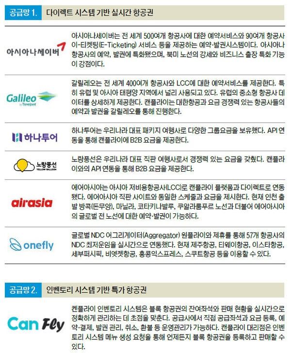 캔플라이의 공급망은 실시간 항공권 관리에서 주목받고 있습니다. GDS, 국내 홀세일러, 항공사 및 글로벌 어그리게이터와의 적극적 연동을 통해 공급망을 확장하고 있습니다. 이런 시스템은 항공권의 등록 및 판매를 쉽고 빠르게 하며, 다양한 항공사와의 협력을 통해 상품 라인업을 풍부하게 합니다. 시스템의 복잡함 속에서도 캔플라이는 독자적인 차별성을 유지하며, 여행사와 소비자 모두에게 다양한 혜택을 제공하고 있습니다.