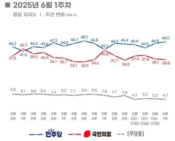 [폴리뉴스 김승훈 기자] 6월 3일 대선이 끝난 후 실시된 여론조사에서 더불어민주당 지지율은 1.2%P 상승하고 국민의힘은 0.3%P 하락한 것으로 나타났다. 이로서 양당 지지율 격차는 13.2%P로 대선 전(11.7%P)보다 벌어졌다.