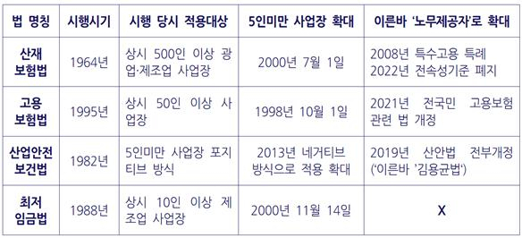 최저임금법의 경우 2000년 11월 14일부터 1인 이상 모든 산업에 적용되는 것으로 대상을 넓혔다, 산재보험법은 2000년 7월 1일, 고용보험법은 1998년부터 10월 1일부터 1인 이상 사업장으로 적용대상을 확대하였다. 산업안전보건법의 경우 2013년까지는 5인 미만 사업장에 적용되는 법조항 명시(포지티브) 방식이었다면 2014년부터 5인 미만 사업장에 적용되지 않는 법조항 명시(네거티브) 방식으로 변경되었다.