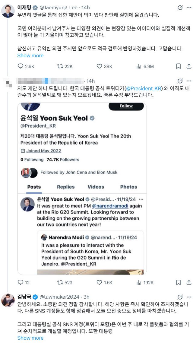 그 가운데 한 누리꾼은 “저도 제안 하나 드린다. 한국 대통령 공식 엑스 (계정)이 왜 아직도 내란수괴 윤석열 씨로 돼 있는지 모르겠다. 빠른 수정 부탁드린다”라고 댓글을 남겼다.