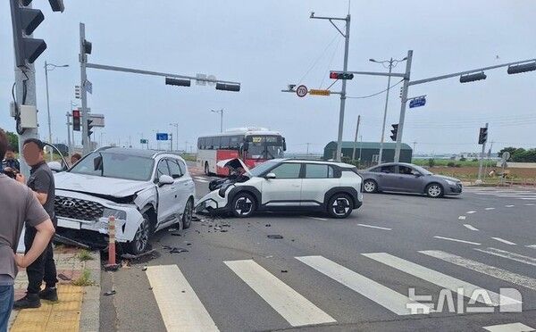 뉴시스 보도에 따르면, 9일 제주소방안전본부 등에 따르면 이날 낮 12시34분께 제주시 한경면 소재 도로에서 싼타페 차량과 EV3 차량이 충돌했다는 신고가 접수됐다.