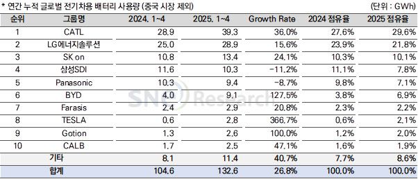 9일 시장조사업체 SNE리서치에 따르면 올해 1∼4월 중국 시장을 제외한 세계 각국의 순수전기차·플러그인하이브리드차(PHEV)·하이브리드차(HEV)에 탑재된 배터리 총사용량은 약 132.6GWh(기가와트시)로 집계됐다. 지난해 같은 기간보다 26.8% 성장했다.