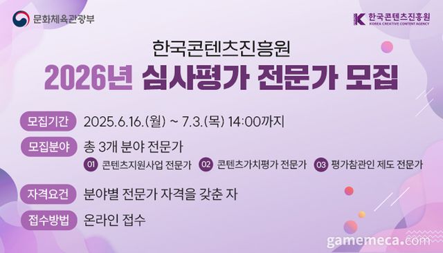 이번 모집은 한국 콘텐츠산업의 다양성과 확장성을 반영하고, 전문성·공정성·현장성을 갖춘 평가체계를 구축하기 위한 방안이다.