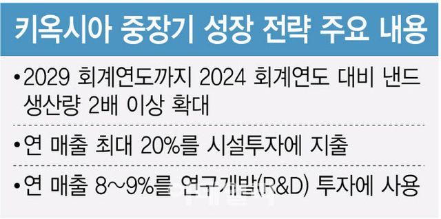 9일 업계에 따르면 키옥시아는 최근 ‘AI 시대 키옥시아의 중장기 성장 전략’을 공개했다. 키옥시아는 회계연도 기준 2029년까지 2024년 대비 낸드 생산량을 2배 늘린다는 계획이다. 이를 위해 연 매출의 최대 20%를 설비투자에 쓴다.