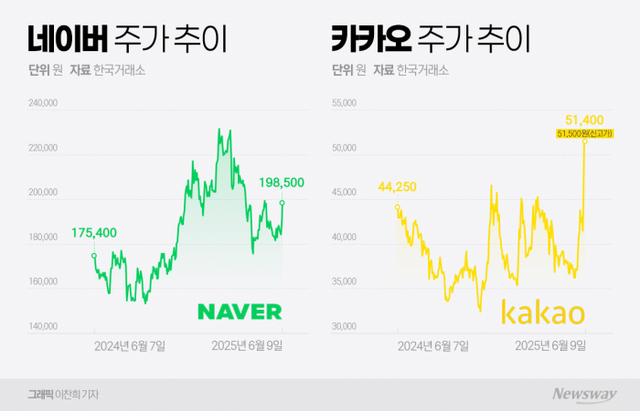 네이버와 카카오의 주가는 이재명 정부 출범 이후 강세를 지속하고 있다. 새 정부가 국내외 거대 플랫폼의 독점적 지위 남용과 독과점을 방지하는 '온라인 플랫폼법' 제정을 공약으로 제시했다. 다만 관련 업계에서는 업계 전반에 걸친 규제 대신 해외 거대 플랫폼 기업을 위주로 한 핀셋 규제와 자국 플랫폼 산업 생태계를 지원하는 방식으로 산업 진흥에 나설 것이라는 전망에 무게를 싣고 있다.